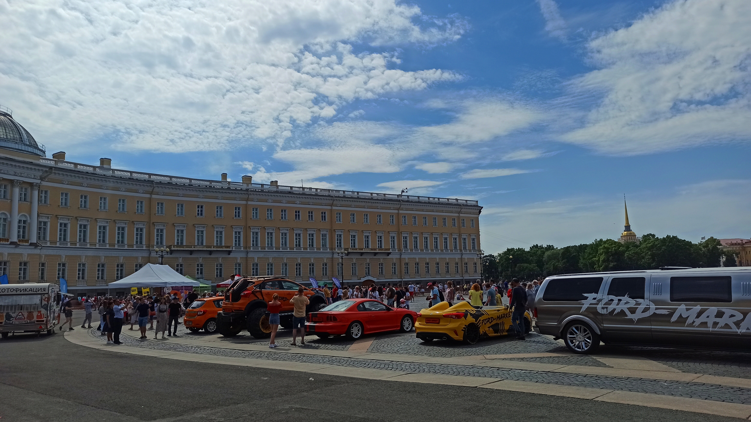 Заодно почему-то устроена выставка авто. Похоже, реклама какой-то фирмы.